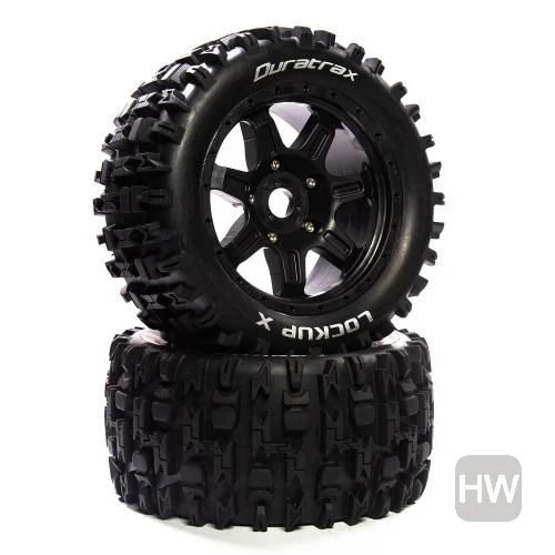 Duratrax offers these factory mounted 1/5 scale LOCKUP MT front/rear tires for the ARRMA KRATON 8S monster truck and ARRMA OUTCAST 8S stunt truck. They feature a tread pattern thatβs perfect for running on a wide range of surfaces: pavement, hard-packed wet or dry, loose-dry loamy, loose-wet mud and grass. Molded from a durable black composite plastic, the 24mm hex wheels measure 3.9 inches (98.2mm) wide and 8.4 inches (212.8) in diameter. The tires include one-piece foam inserts and are made from medium firm CS Sport compound. Sold in pairs.